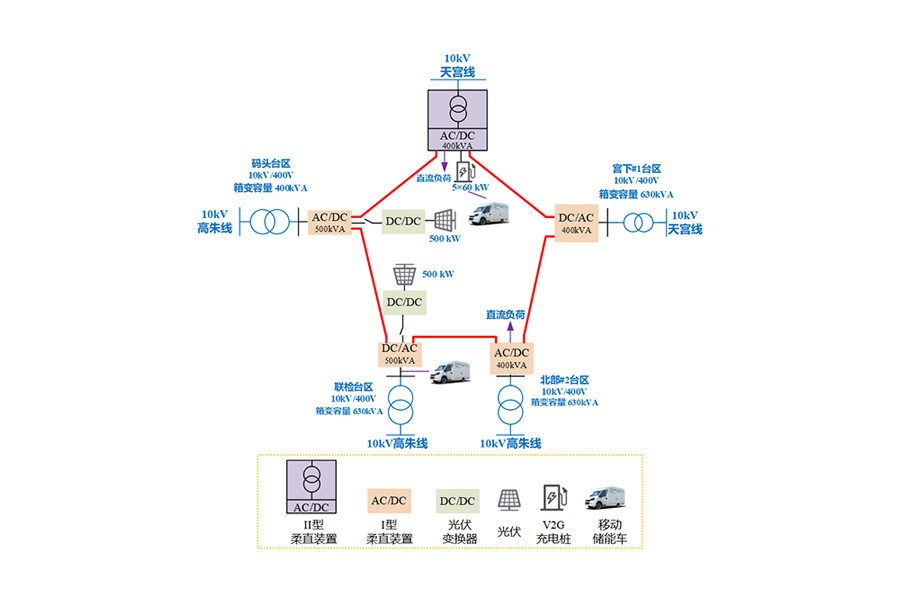 应用分散式部署的柔性互联装置,配套接入分布式光伏电源、移动储能装置、电动汽车充电桩等多元素源、荷,建立“源网荷储”协同互动的互联台区微电网系统。
